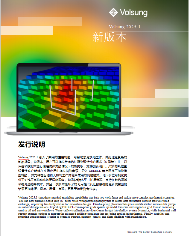 • Vlosung现已成为 Seequent 产品系列的一部分。 • 新增Volsung 帮助与支持页面。 • 根据 Seequent 更新了法律条款, 并添加了指向 Seequent 网站的相关链接。可通过 Seequent 网站获取的示例数据集。 • 用户界面/用户体验、可视化效果和报告功能的改进。 • 在 Volsung 2024.1 版本中, 旧版的许可证密钥文件不再受支持。 • 用户需要联系 support.volsung@seequent.com 以获取新的 LicenseSpring 许可证1.20。 • 更改新的构建编号命名规则。Volsung版本现在采用“主版本号.次版本号. 日期”的格式 。 • 新的用户或密钥许可系统。旧许可文件在一段时间内仍可使用。 • 补给区可以是单向的。 • 基于层的地质模型现在也支持三维体。 • 层状地质模型中对 3D 体积的 Leapfrog LFM 支持。 • 支持来自 LeapFrog 的 GOCAD 文件。 • 改进了地质模型断层的网格划分性能。 • 以 Leapfrog 能识别的 CSV 格式导出带时间标记的储层数据。 • 井筒模拟器热损失计算的最小流动时间选项。 • 表面网络模型独立模式的改进。现有模型可能需要重新运行以反映这些变化。 • 从安装程序中移除 MESA3D 软件包。需要此软件包的用户必须手动安装。 • 移除临时网格/井眼轨迹显示功能。