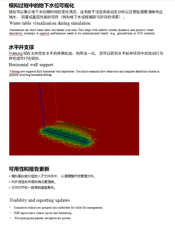 • Simulate closed‑loop (U‑tube) wells with thermosiphon physics for heat extraction without fluid exchange. • Position pumps at any depth in the wellbore to reflect real configurations and improve calibration. • Import corner‑point GRDECL grids to reuse existing models and speed up project setup. • Visualise water‑table movement during simulation to understand shallow system dynamics. • Model fully horizontal well trajectories for complex reservoirs and unconventional designs. • Organise outputs into subfolders, improve PDF report clarity, and benefit from faster file handling and UI tweaks.